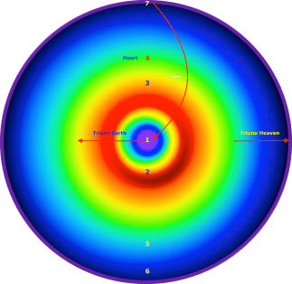 We may also see that this total area is the Triune Heaven relative to this area here—what we have called the Triune Earth. What is above is spirit, present in the dimensional world, and the fourth, the level of the heart, represents the connection, the heaven, between what is above and what is below. What is below is the Triune Earth—we could look at them as spheres, which gives them another dimension, one inside the other. The visible earth is at the center. Insofar as physical vision is concerned, that is the only one that is visible. All the others are invisible. And if we were looking at the planet earth we might recognize the fact that it is much larger than the physical ash at the center. It could extend out to about the orbit of the moon.
