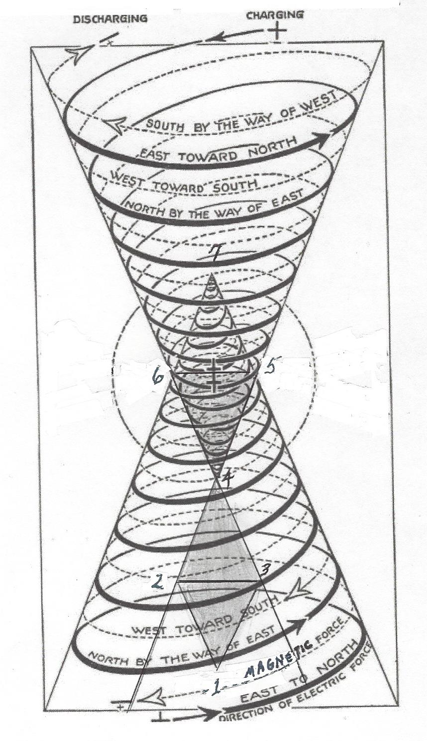 According to Russell’s inspired vision of this electric universe, a negative charge repels both negative and positive charges, simply based on its unwinding centrifugal force of radiation outward from its vortex apex of positive magnetic centripetal contraction—the latter inhaling and compressing energy and the former exhaling and decompressing the energy of bifurcated Light. (See diagram above)